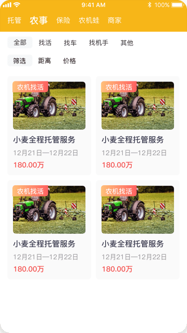 查詢農事補貼,農機找活,農事找車,可篩選距離,價格等。